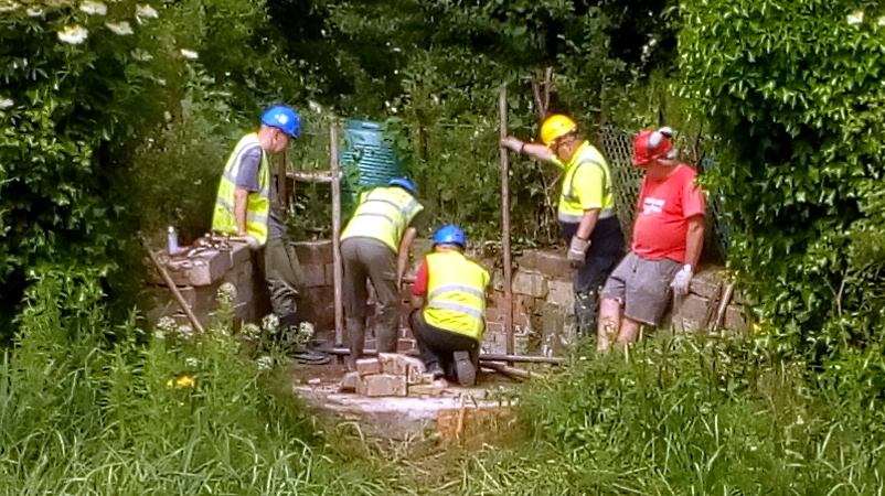 They also began the repairs to the old spill weir on the offside of the canal where the first, and not insignificant, task was to make a safe working area by blanking off the very deep outlet at the back of the weir.
